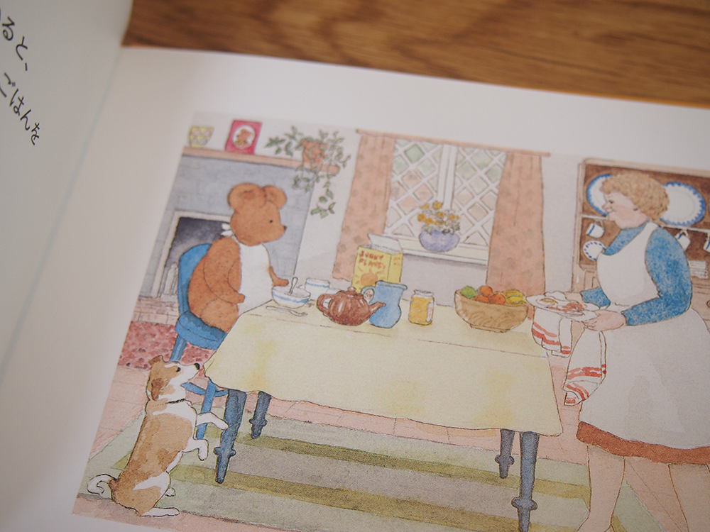 ぬいぐるみのようなくまさんが、人間たちの町でかいがいしく働くようす、外国の街並み。町の人やくまさんの家のインテリアのひとつひとつに見入りながら、どこか気になっていました。