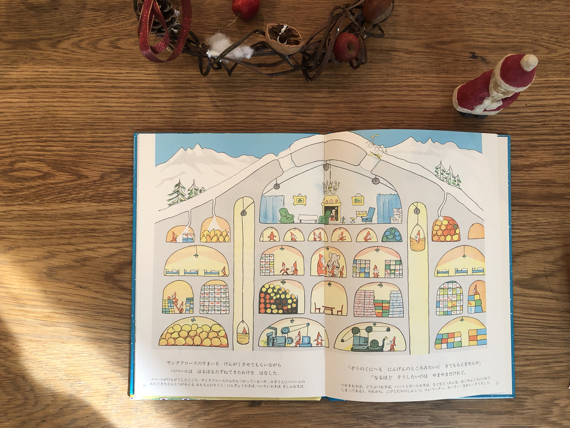 わたしは、この、地中のサンタハウスの断面図が、好きで好きでしかたありません。細かくみても・・・細かく見ようもなく・・・プレゼントの種類ごとに収納庫が分かれているみたいなのですが、全部、箱だし・・・子どもが描いたみたいな、そんな、夢にみていたままみたいな絵が最高です。